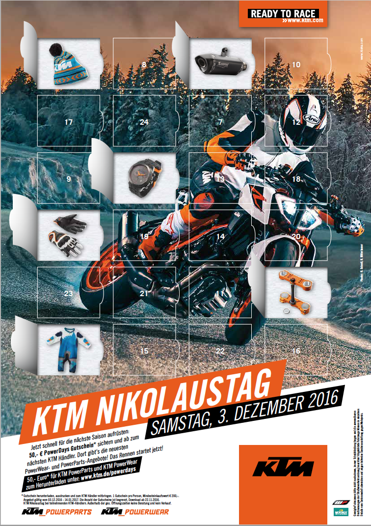 Es ist wieder so weit, der Winter kommt und es weihnachtet langsam bei KTM Kosak. Traditionell laden wir Sie zum KTM Nikolaustag am 03.12.2016 zu uns ein. Es warten verlockende Angebote und ein Gutschein im Wert von 50 €* im Rahmen der KTM Powerdays 2016 auf aktuelle KTM Powerwear und KTM Powerparts. KTM Gutschein ab dem 21.11.2016 downloaden unter www.ktm.de/powerdays