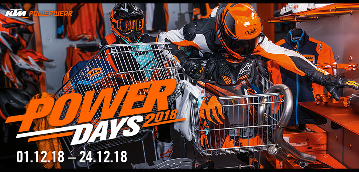 Dann läute die Weihnachtszeit mit den KTM PowerDays 2018 und ausgiebigem Powershopping ein! Lade noch heute deinen 50 EUR-Gutschein herunter, und decke dich bei deinem autorisierten KTM-Händler mit den neuesten KTM PowerWear-Artikeln ein.