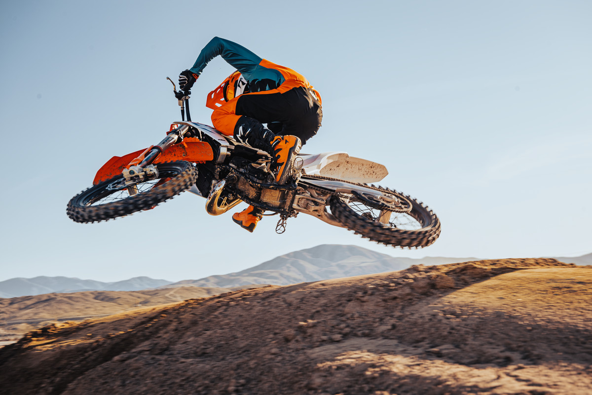 Nach dem Start des Motors mit dem serienmäßigen Elektrostartersystem (bei allen Modellen integriert) rasen die KTM SX-Bikes die erste Gerade hinunter und nehmen souverän Kurven und Sprünge. Unsere Motoren sind kompakter, länger haltbar, einfacher zu warten und bieten das beste Leistungsgewicht in ihrer Klasse.
