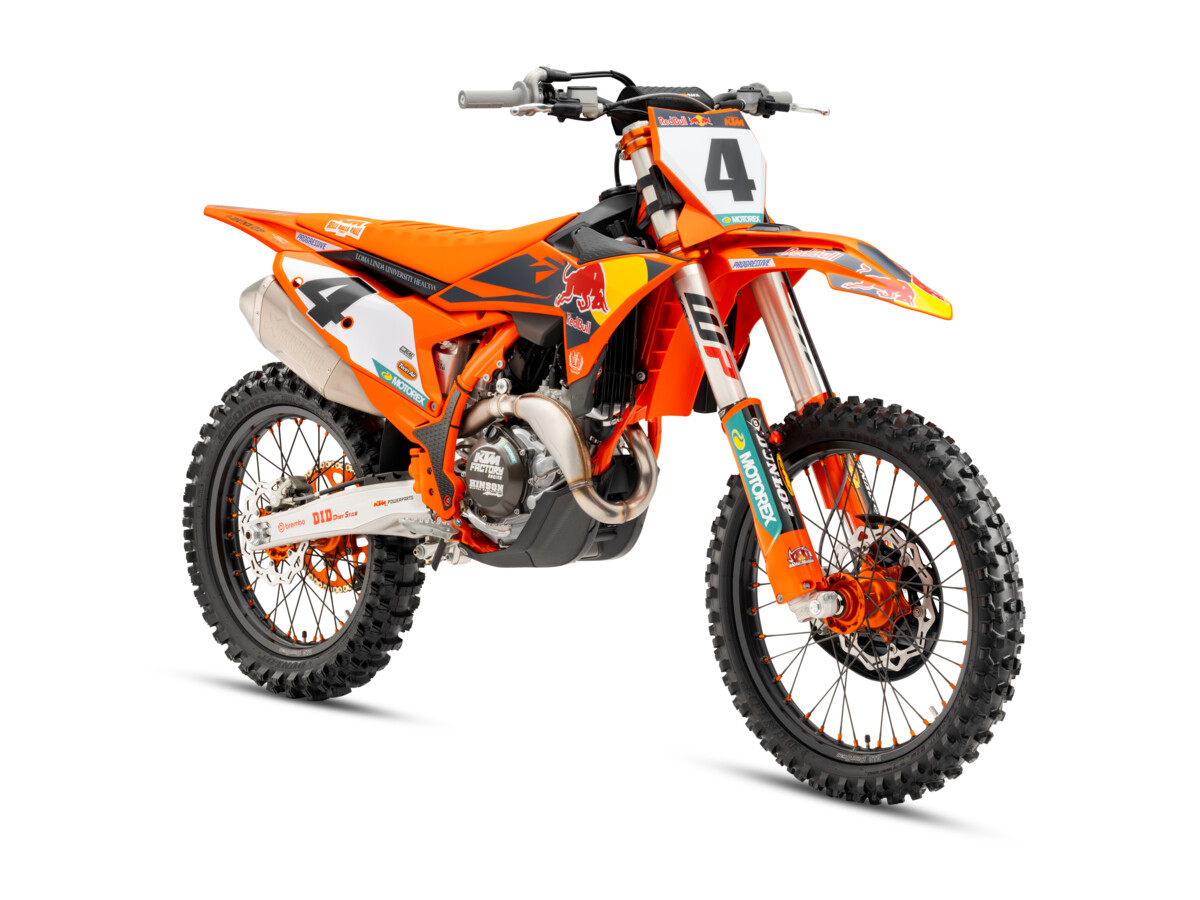 Das 2025er Line-up trägt das neueste Motorsport-Design und die neuesten Grafiken für die kommende Saison und bietet dem Kunden die Wahl zwischen #4 (Sexton) #7 (Plessinger) oder #1 (Vialle) für die KTM 450 SX-F bzw. KTM 250 SX-F FACTORY EDITIONs. Diese Modelle kommen den Rennmotorrädern der Profis am nächsten, dank einer Vielzahl von technischen Upgrades aus dem KTM PowerParts Produktportfolio.