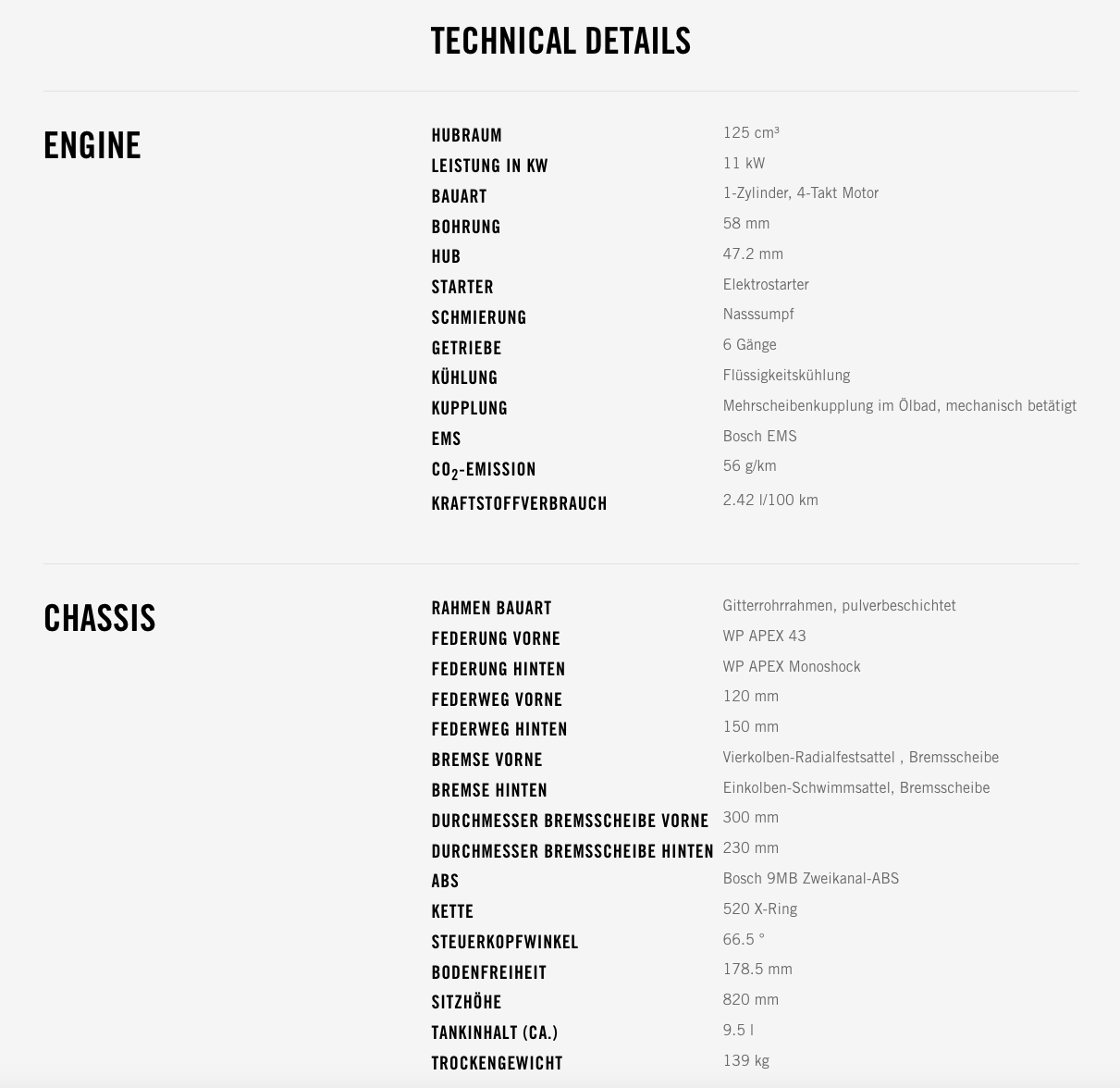 Die Einstiegsmaschine für wahrlich ambitionierte Rennfahrer. Der hochmoderne Motor mit Flüssigkeitskühlung leistet 11 kW (15 PS), hat ein Drehmoment von 12 Nm und bietet echte Rennsport-Performance für den täglichen Einsatz. Mit der straßenzugelassenen KTM RC 125 wird jede Fahrt zu einer Vorbereitung aufs nächste Rennen.