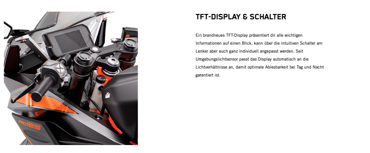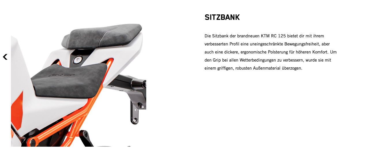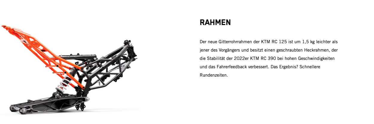 Die KTM RC 125 der Generation 2022 nimmt stolz ihren Startplatz ein und brennt darauf, der Konkurrenz einen vor den Latz zu knallen. Mit ihrem völlig neuen Fahrwerk, einem dramatischen, von der MotoGP inspirierten Styling, einem noch schärferen Handling sowie einer noch besseren Ergonomie ist die KTM RC 125 bereit, auf der Rennstrecke und der Straße auf die Jagd zu gehen und dabei echtes Racing-Feeling zu verbreiten.