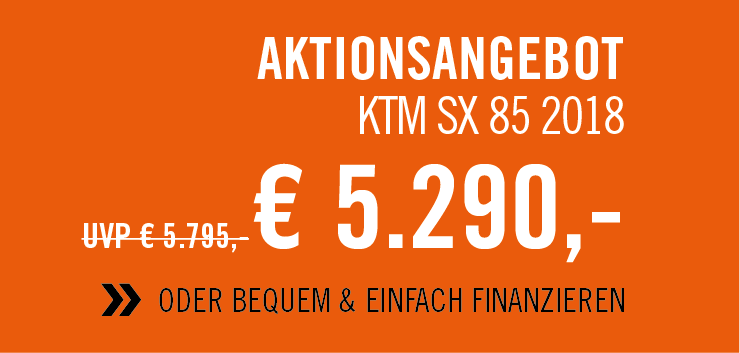 Für das Modelljahr 2018 wurde die SX-Reihe um die brandneue KTM 85 SX für Junioren, die sich in den kleinsten Klassen ihre Sporen verdienen wollen, erweitert. Auf ernsthaften Motorsport ausgerichtet, ist der Motor 0,69 kg leichter als jener des Vorjahresmodells und bietet über das gesamte Drehzahlband eine höhere Leistung und bessere Fahrbarkeit. Zudem besitzt die KTM 85 SX ein leichteres Fahrwerk mit einem überarbeiteten Chrom-Molybdän-Stahl-Rahmen von WP Performance Systems und einem leichteren Heckrahmen. Dieses READY TO RACE Bike, welches das KTM Mini Aufgebot für aufstrebende Nachwuchstalente um die KTM 50 SX und KTM 65 SX komplettiert, ist mit hochwertigen Bremsen von Formula, einer WP AER 43-Gabel und einem speziell entwickelten WP Xplor-Federbein mit progressivem Dämpfungssystem, welches ein hervorragendes Ansprechverhalten, volle Einstellbarkeit und einen herausragenden Schutz gegen Durchschlagen bietet, ausgerüstet.