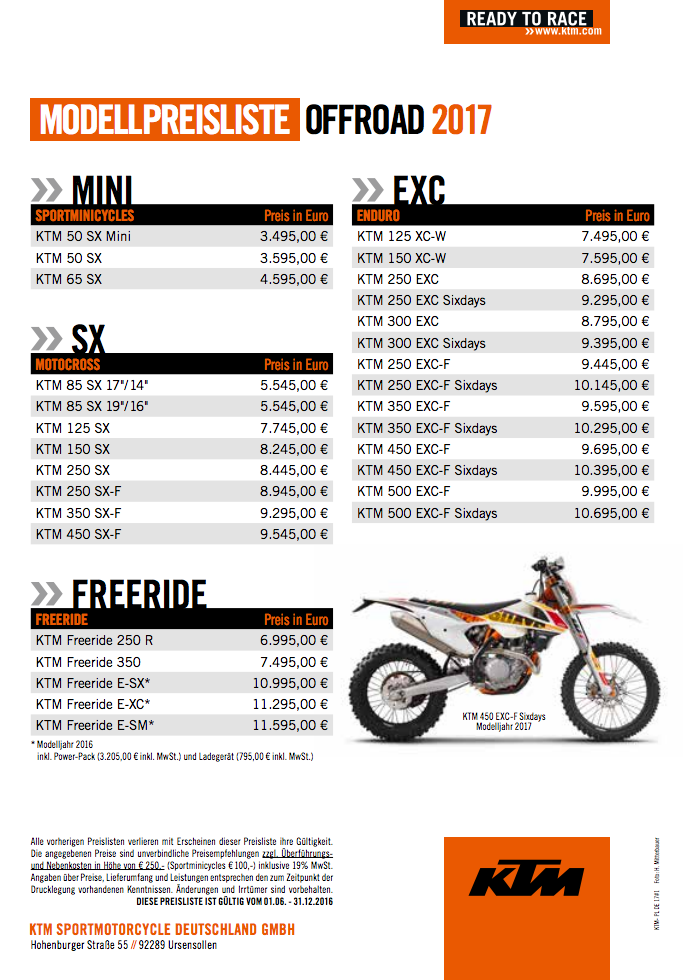 Die aktuellen Preise der KTM Modelle Offroad 2017. Bei Fragen zu den KTM Preisen sprechen Sie uns an.