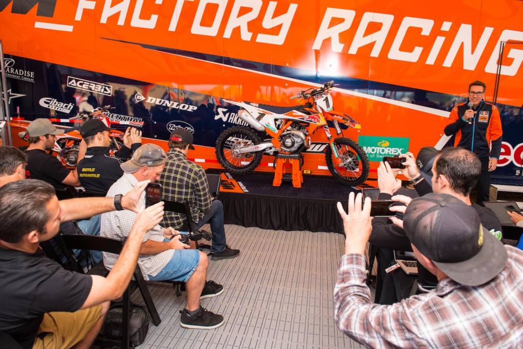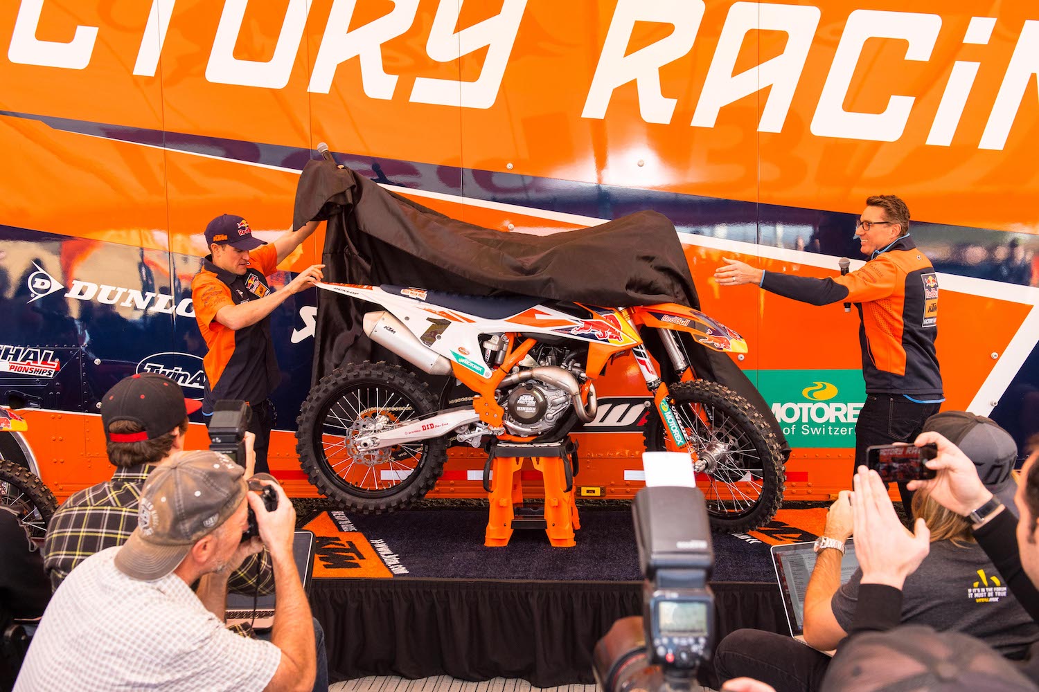 KTM präsentierte außerdem seine mit Spannung erwartete KTM 450 SX-F Factory Edition, welche ab Ende Dezember ausschließlich in den USA erhältlich sein wird. Für das Modelljahr 2018 entwickelt, bietet dieses limitierte Modell einige spezielle Teile, einschließlich der Red Bull KTM Factory Racing-Grafiken, eine orange eloxierte Gabelbrücke, einen Hinson-Factory-Kupplungsdeckel, D.I.D. Dirt Star-Felgen, eine Factory-Sitzbank mit Selle Dalla Valle-Logo, eine schwimmend gelagerte Bremsscheibe vorne und vieles mehr. Zusätzlich dazu besitzt dieses Bike ein neues Bodywork, ein überarbeitetes Fahrwerk, eine neue Federungsabstimmung mit einer neu entworfenen Gabelbrücke, ein verbessertes Kühlsystem mit neuem Kühler, einen neuen Endschalldämpfer sowie einen überarbeiteten Motor mit neuem, kompakterem Zylinderkopf, der die Leistungsabgabe verbessert. Diese äußerst spezielle KTM 450 SX-F Factory Edition gleicht dem Bike, das die KTM-Werksfahrer unter den amerikanischen Homologationsregeln einsetzen und repräsentiert die neueste Technik des Werks im österreichischen Mattighofen.