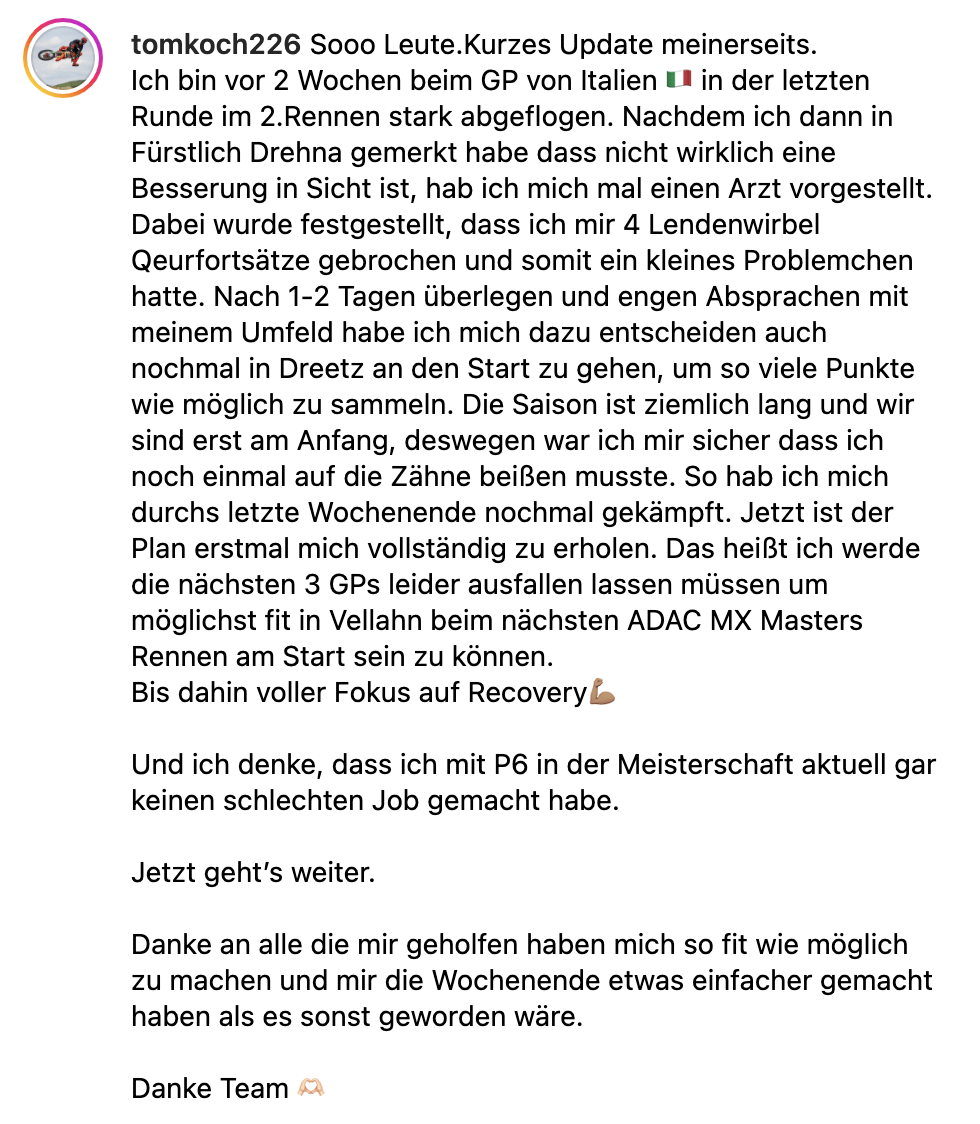 Tom Koch muss aufgrund seiner Verletzung, die er sich schon in Arco zugezogen hatte, drei Wochen pausieren.