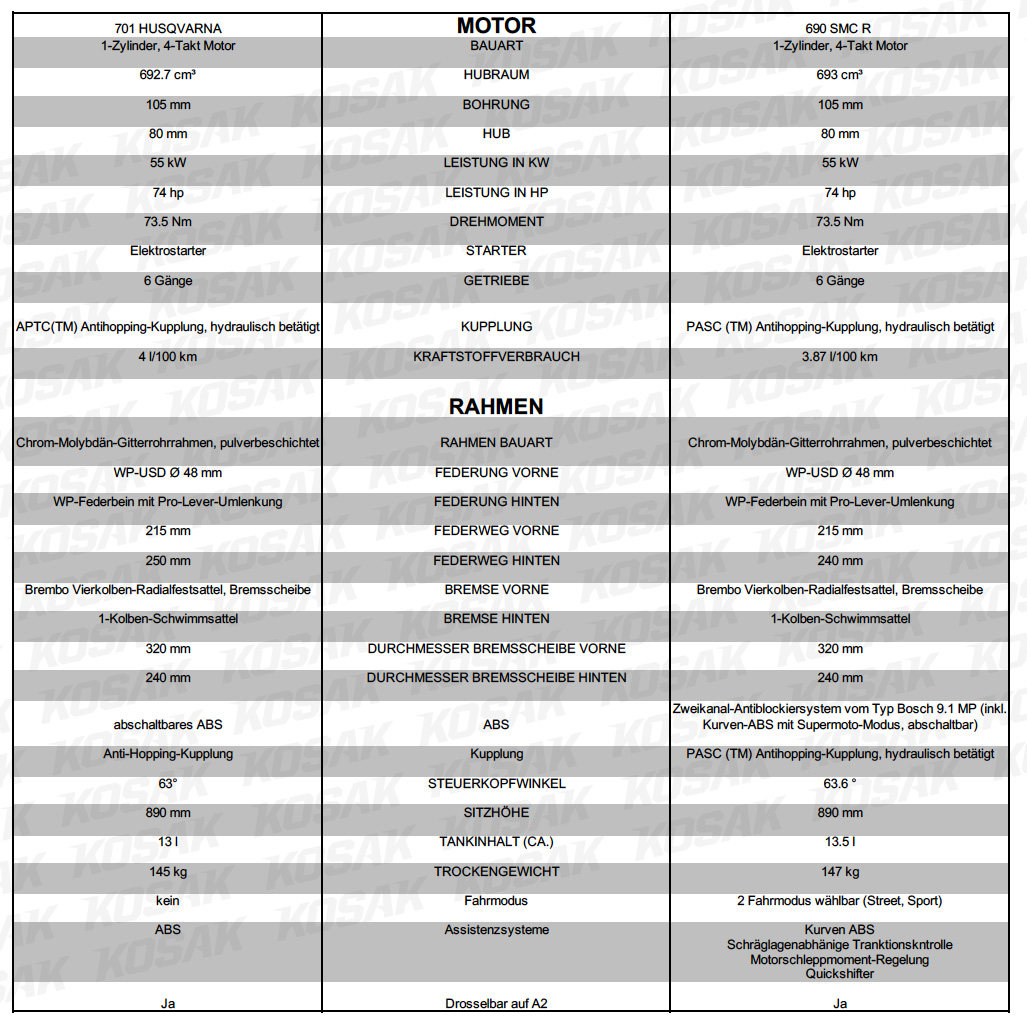 Die zwei Supermoto aus dem Haus KTM und Husqvarna kommen zwar von den gleichen Hallen in Mattighofen jedoch unterscheiden sich die 701 Supermoto von Husqvarna von der KTM 690 SMC R besonders bei der elektronischen Ausstattung. Vergleicht die zwei Supermoto unten in der Tabelle.